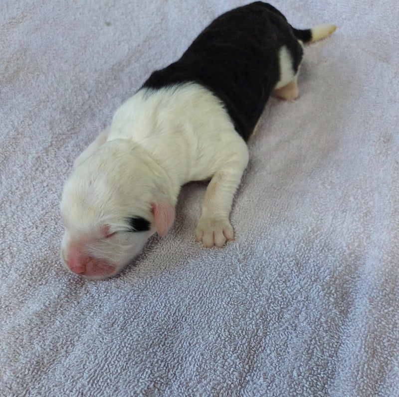 The puppy was finally born at 4:10 a.m. This was a male weighing 528 grams, so I completely understand that she was in pain. She latched on immediately after weighing, and that went well.