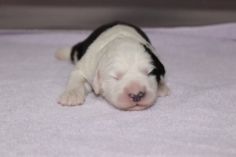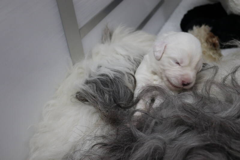 Since a few days we have a panda bear in the whelping box. How nice that you can see the comparisons between an Old English Sheepdog puppy and a panda bear.
