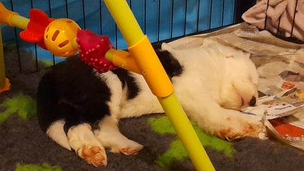 The puppies are doing very well. We've also increased their living space in the kitchen by opening up the puppy panels during the day. They love this.