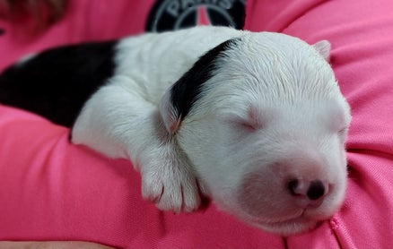 The first puppy was born at 12:15 am. It was a male weighing 554 grams. Very well done by Jessy. Quite a large puppy and even in breech position.